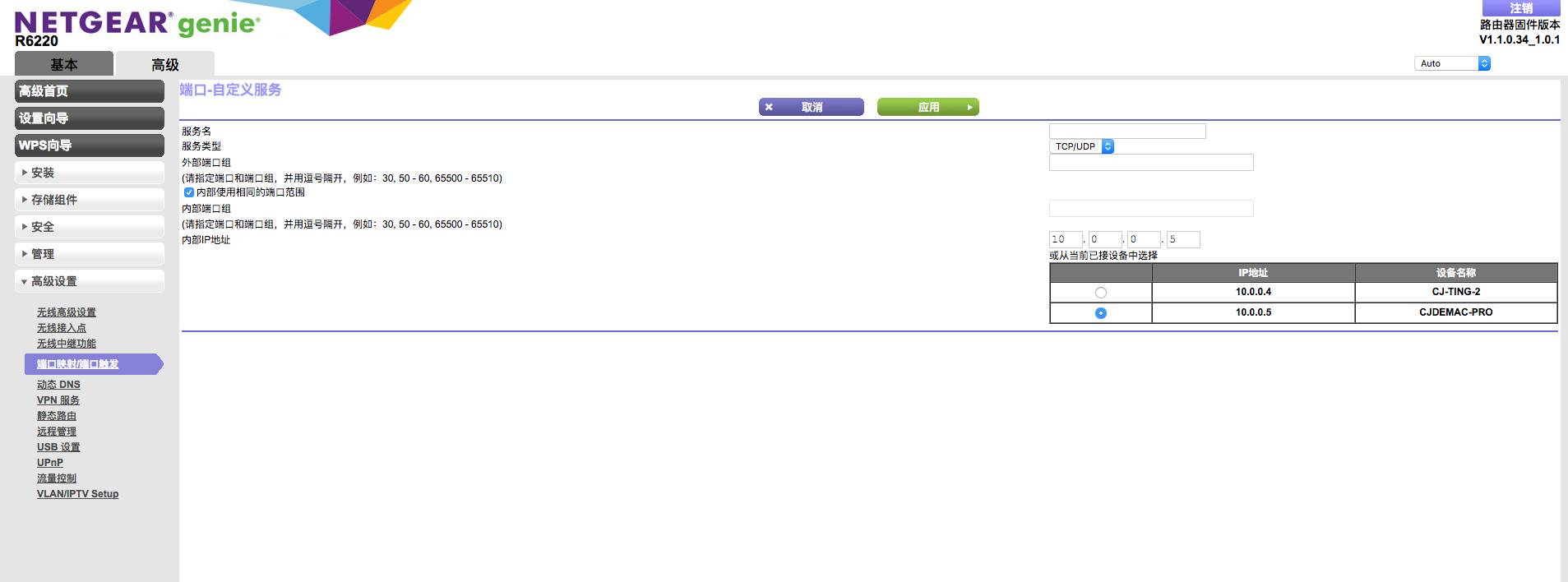 首先,我们可以手动添加 NAT 表项,大部分路由器里面都有这个设置项。我的 NETGEAR 路由器的设置页面如图所示。