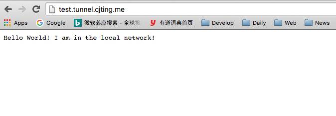 客户端会转发本地 8080 端口的服务到 test.[NGROK_BASE_DOMAIN] 上。以我为例,只要我访问 test.tunnel.cjdev.me,就可以看到开发主机上 8080 端口的内容。实现了外网访问内容的目标。