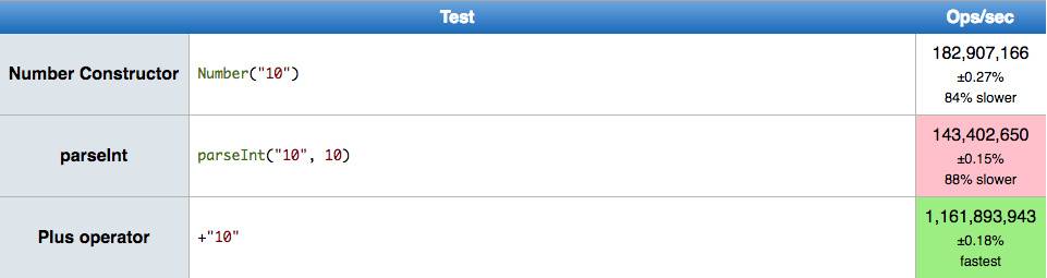 我们都知道,性能最好的代码往往并不是优美直观的代码,往往看起来非常晦涩。下图是 JS 转换字符串到数字的三个方法在 Chrome 下的性能对比。可以看出,+ 是最快的方法。但是 +str 这种写法明显是不如 parseInt(str) 或者是 Number(str) 容易理解。Donald E.Knuth 的那句话,我的理解就是在提醒我们,不用使用 +str,而应该使用更加语义化的 parseInt(str)。