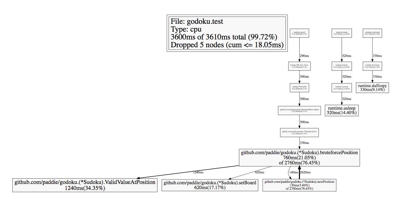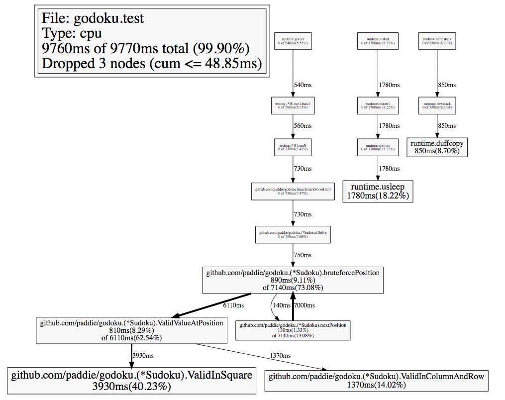 下面我用 Godoku 这个项目为例,看看怎么具体优化一个程序。Godoku 是一个 Go 编写的暴力破解数独的程序,逻辑比较简单,从上到下从左到右扫描每一个空格,从 1 到 9 开始填写数字,一旦数字无效(行冲突,列冲突或者 9 宫格冲突),那么就换一个数字,如果所有数字都换了还无效,那么就退回上一个格子,继续这个过程。