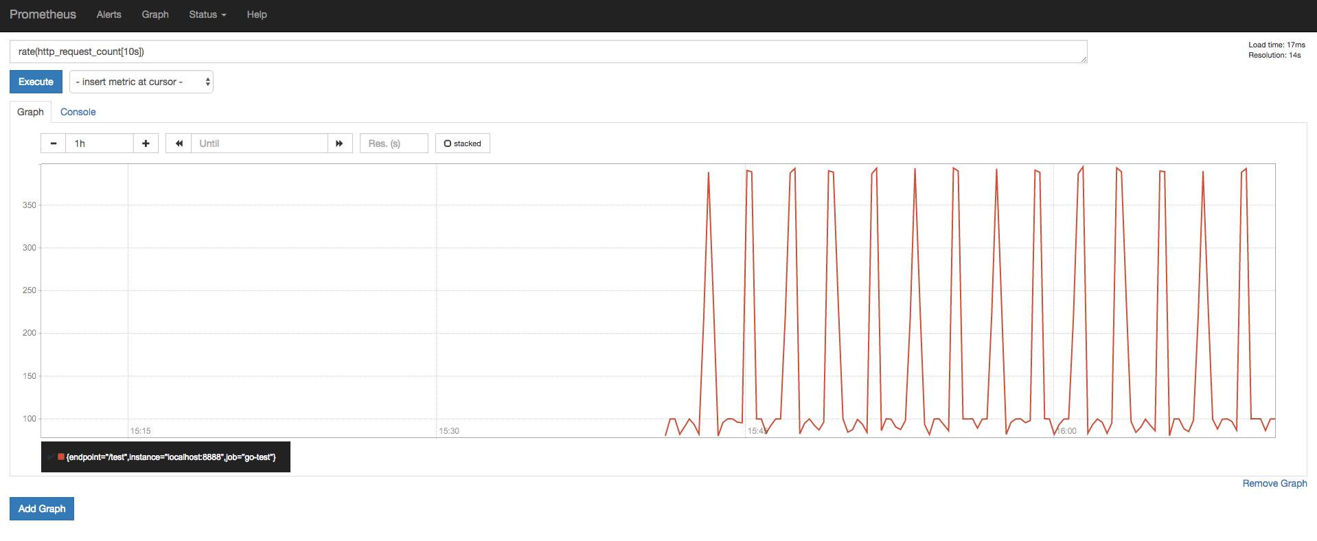 Prometheus 的控制台自带一个简单的绘图系统,点击 graph标签页,输入表达式就可以看到图表。例如,输入 rate(http_request_count{endpoint="/test"}[10s]) 就可以看到我们测试程序中 /test路径的 QPS,从图中可以明显发现,每隔一段时间就会有一个波峰流量。