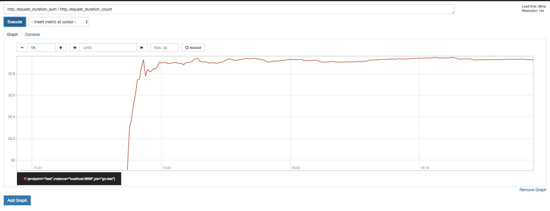 通过使用表达式 http_request_duration_sum / http_request_duration_count 我们可以得到平均响应时间,如下图。当然,这个图的作用不大(平均数往往反映不了什么问题),不像上图那样,我们无法看出有部分请求花费了大量时间。