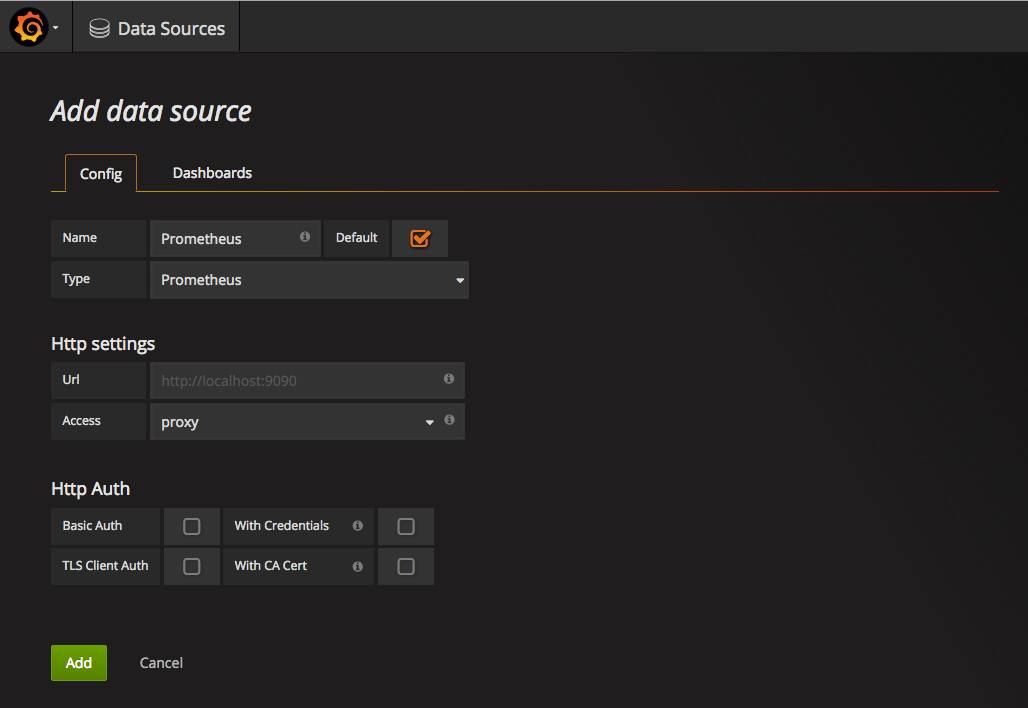 输入用户名和密码以后,进入 Grafana 页面。第一件事是要设置数据源 (Data Source),即 Grafana 从什么地方获取数据,选择 Prometheus 即可。