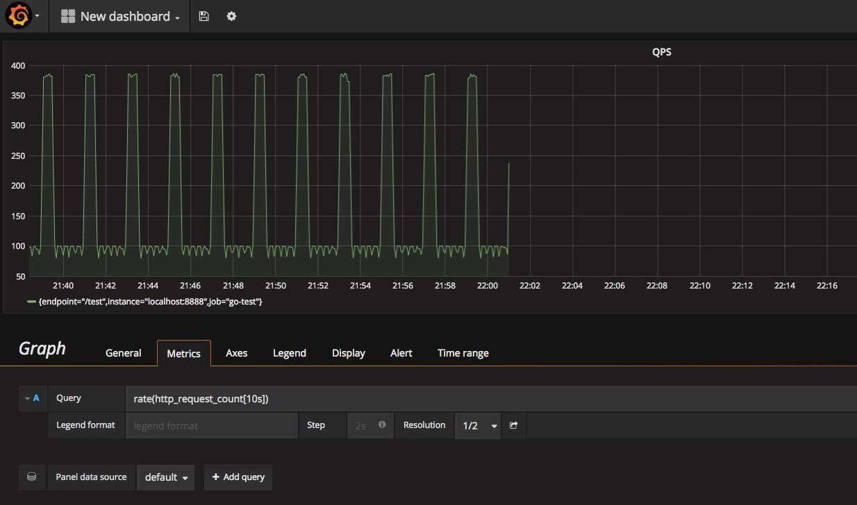 点击图表标题,选择 Edit 来编辑图表参数。最重要的参数就是 Metrics 标签里的 Query字段,这个字段定义了我们的图表到底要展示什么数据。输入 rate(http_request_count{endpoint="/test"}[10s]),就可以看到 /test 路径的 QPS 曲线了。