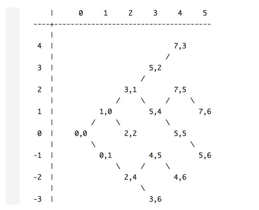 下图横轴代表 d,纵轴代表 k,中间是最优坐标,从这张图可以清晰的看出,当 d=5,k=1 时,我们到达了目标坐标 (7, 6),因此,”最短的直观的“路径就是 (0, 0) -> (1, 0) -> (3, 1) -> (5, 4) -> (7, 5) -> (7, 6),对应的 diff 如下。