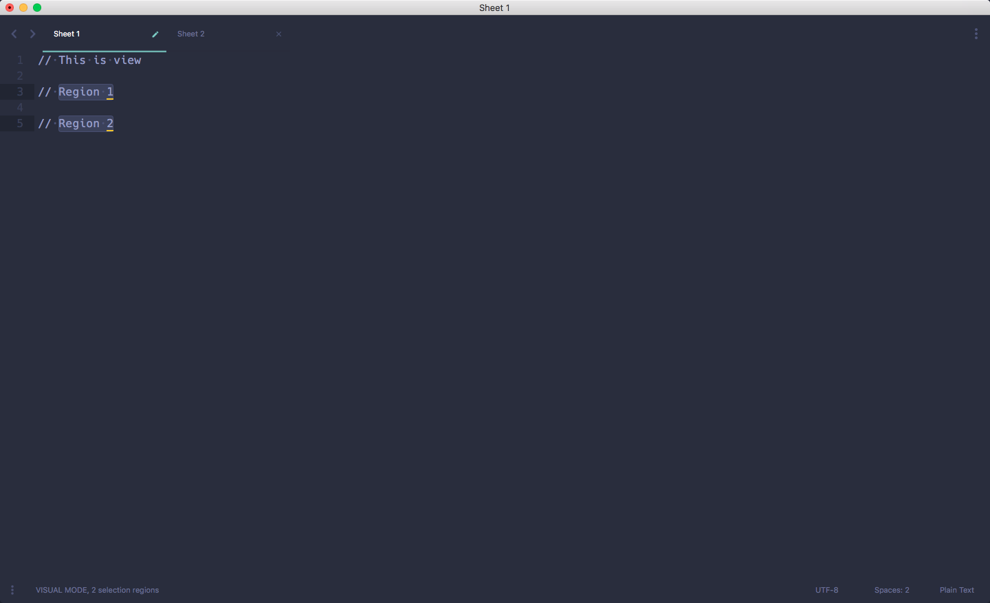 Window: 很好理解,就是一个 Sublime 窗口Sheet: 基本上等于 Tab,就是每一个标签页View: 相当于 Vim 中的 Buffer,表示每一个被编辑的文本Region: 一个连续的区域Selection: 当前选中的内容,由一或多个 Region 构成,因为 Sublime 允许多个光标,所以需要区分 Region 和 Selection
