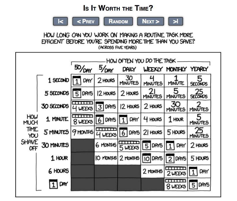XKCD 的这幅漫画很能引发思考,在你动手 切换工具/造工具/改进工具 的时候,一定要评估一下你投入的时间以及节省的时间是否匹配。