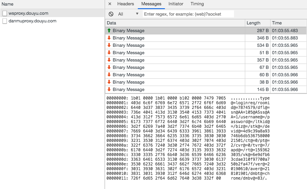 虽然是二进制消息,但是可以看到消息主体都是可读的文本,很明显,斗鱼这里是自己实现了一个内部协议格式。